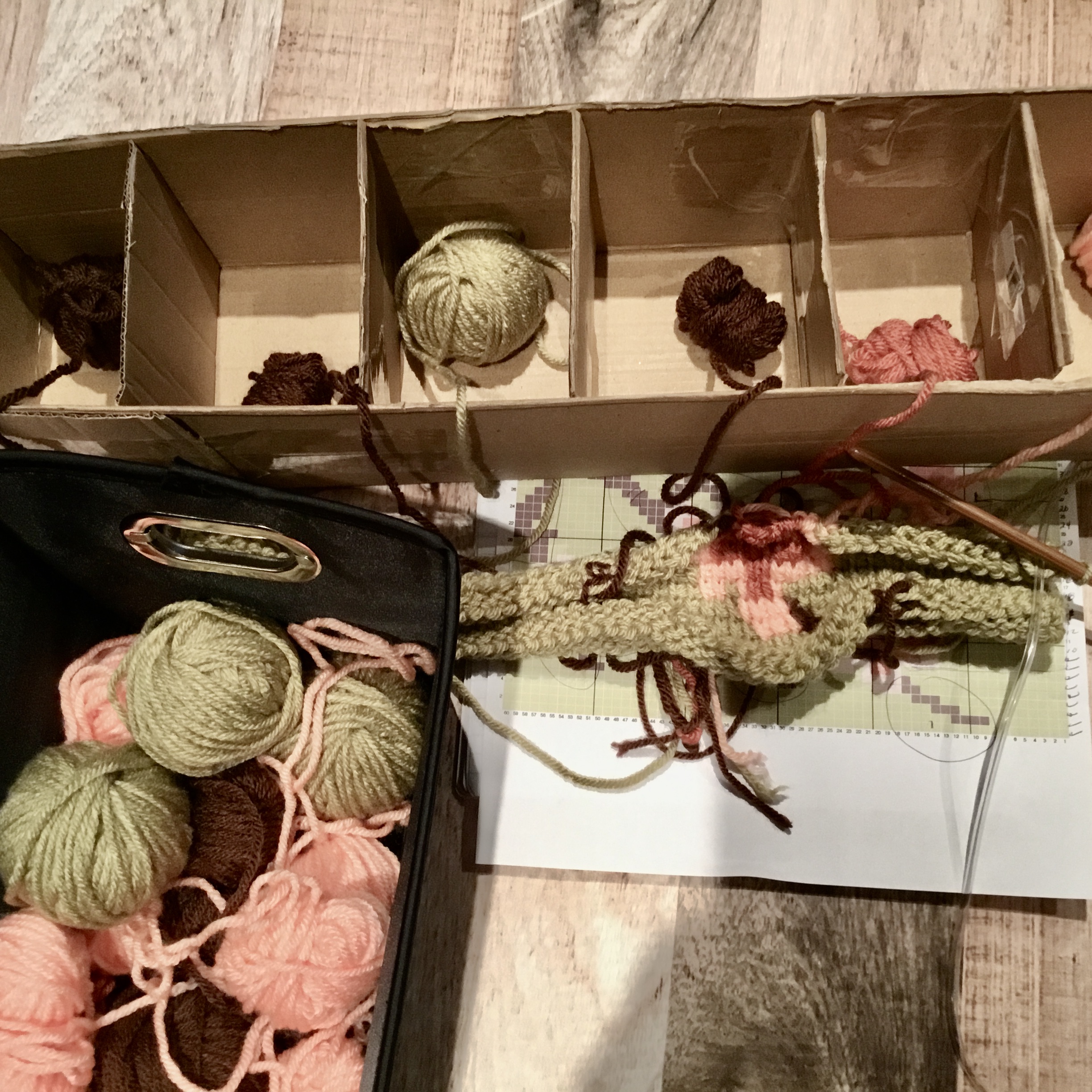 Pour celles et ceux qui sont des habitués de travailler avec des schéma où il y plusieurs changements de couleur, que ce soit en crochet tunisien ou n’importe quelle maille, nous faisons face à l’inévitable mélange des fils qui faut démêler souvent avant de continuer le travail sinon on devient fou! Quand nous utilisons la méthode des bobines (ce qui signifie plusieurs petites balles de laine dépendant de la complexité du dessin à reproduire) les bobines peuvent être éparpillées et mélangées. Un astuce très simple est de recycler une bonne boîte et se créer des compartiments pour recevoir les bobines. Quand vient le temps de les démêler, nous changeons les bobines de compartiments dans l’ordre qu’elles seront utilisées dans le prochain rang.