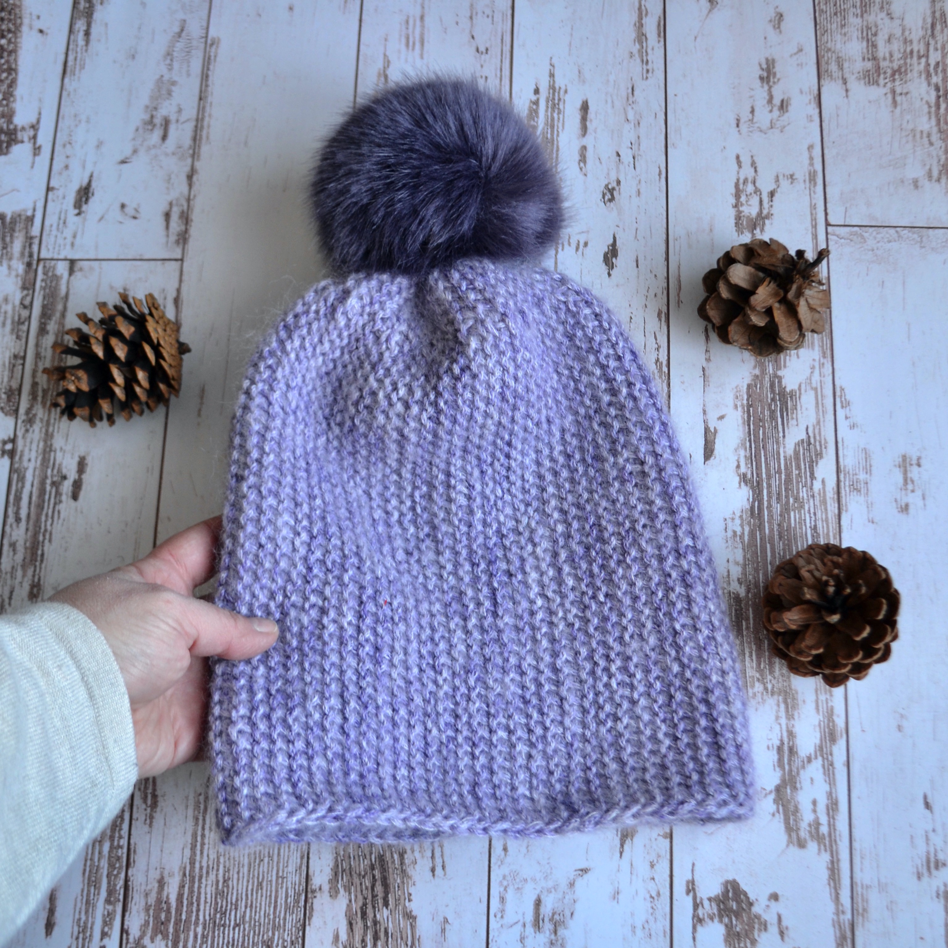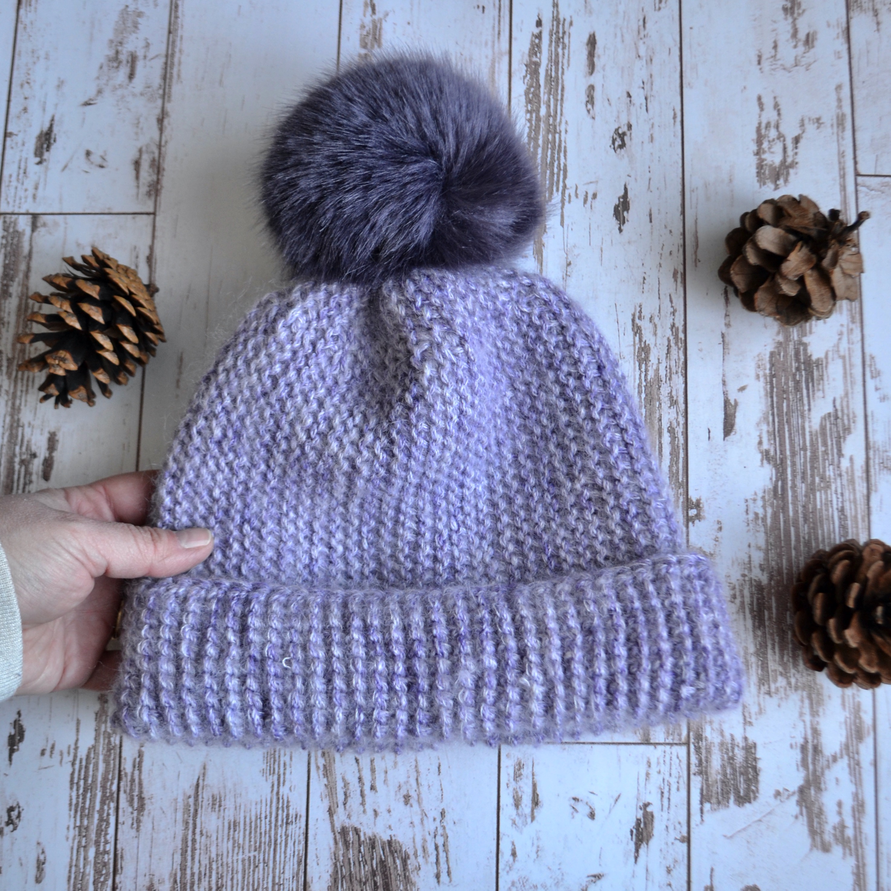 Les choix de laine pour faire ce modèle sont vraiment sans limites. Cette version lavande a été fait en combinant une DK avec un fil de mohair. De la douceur pure!