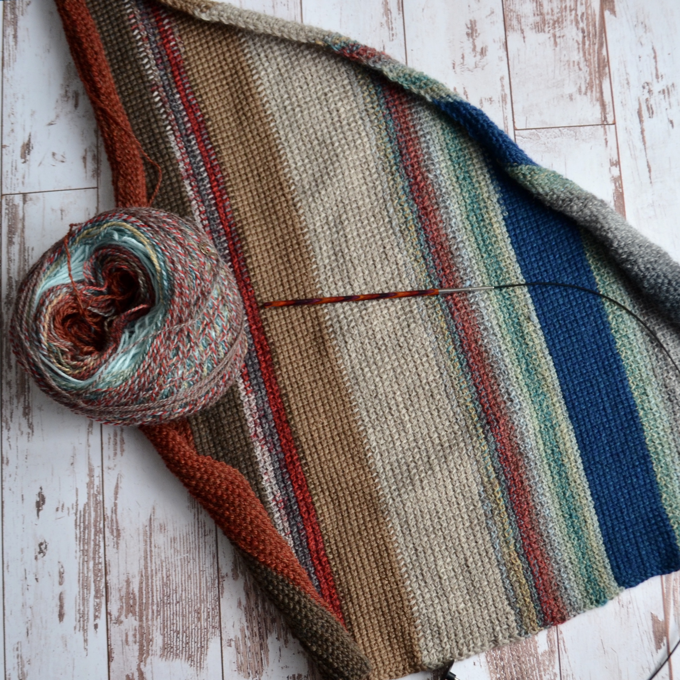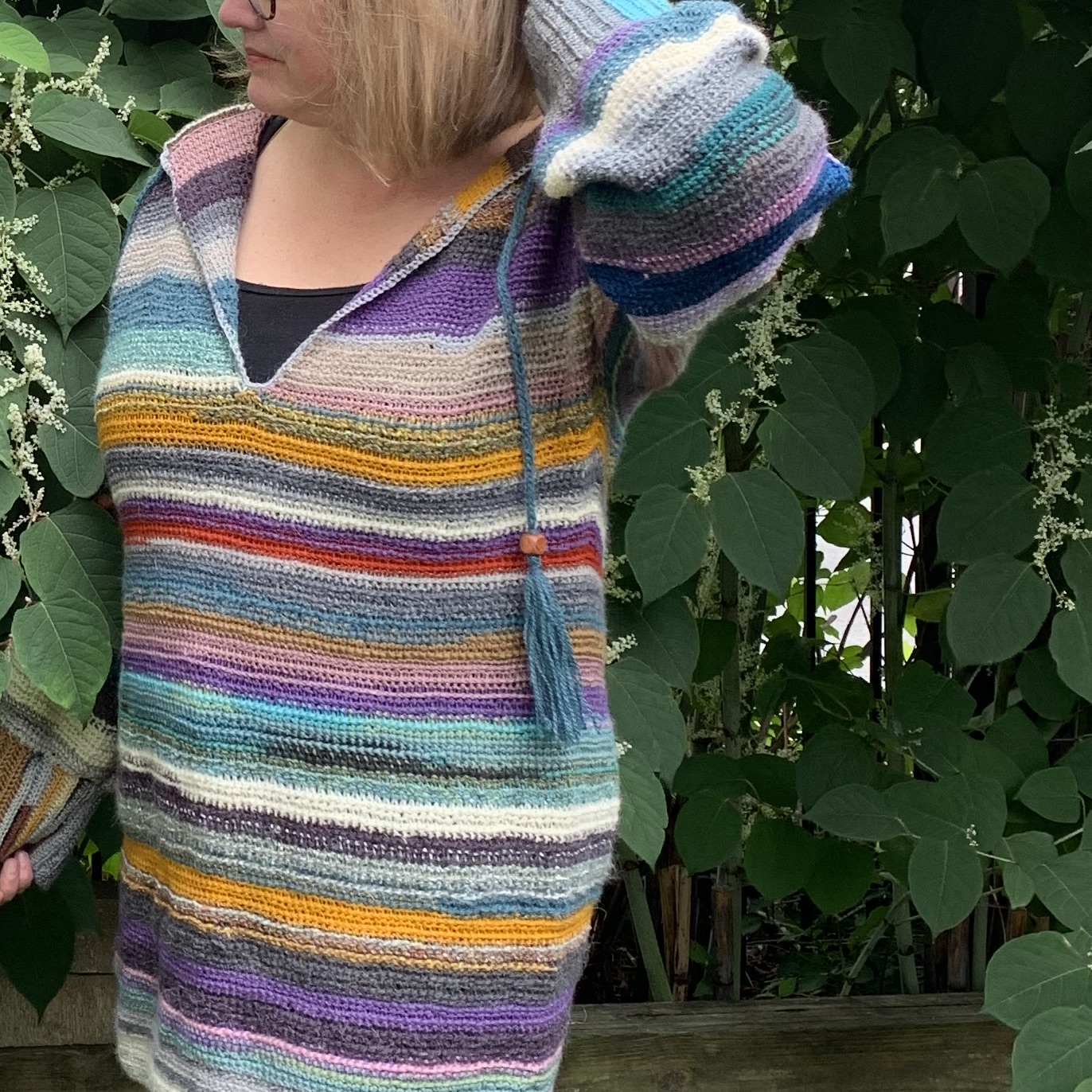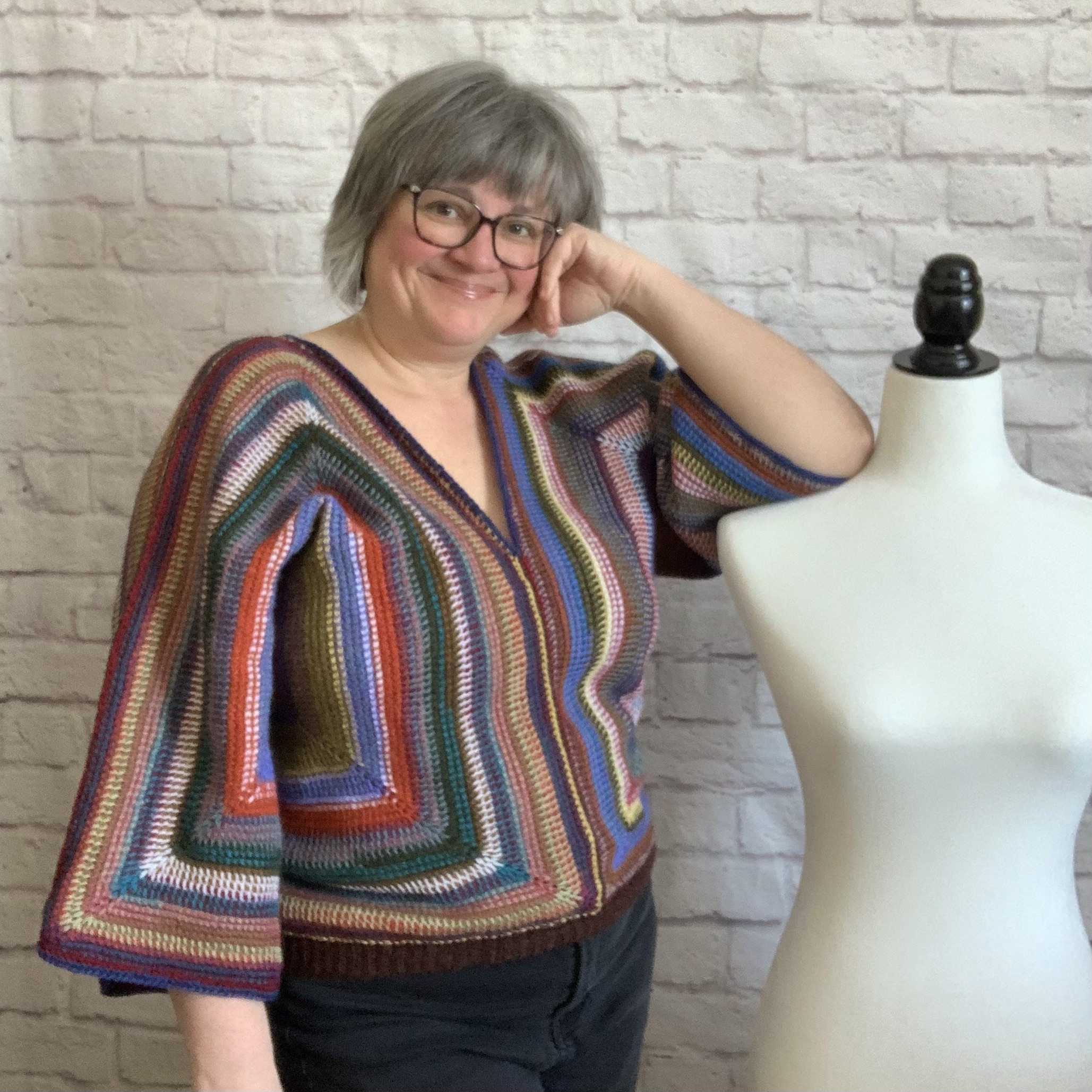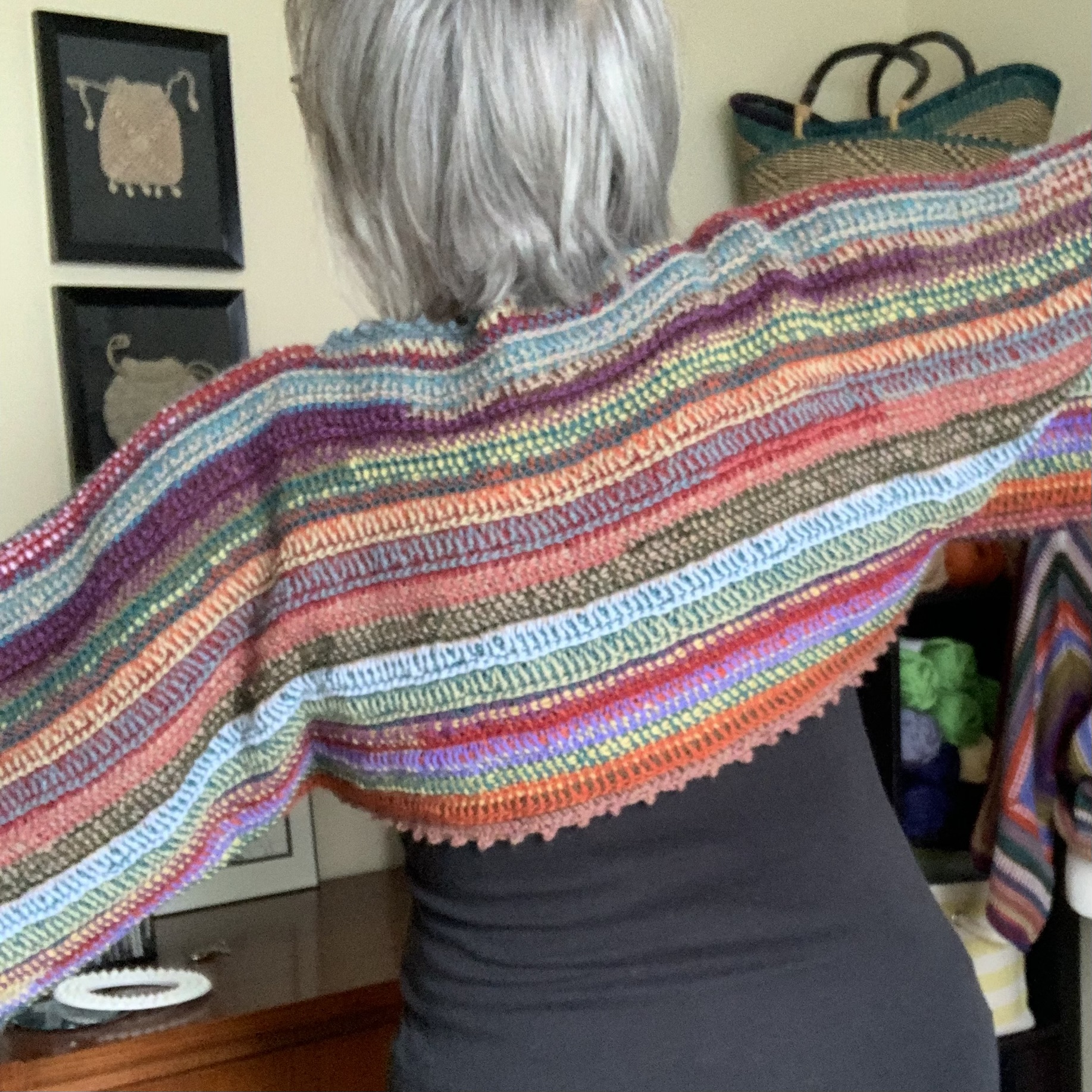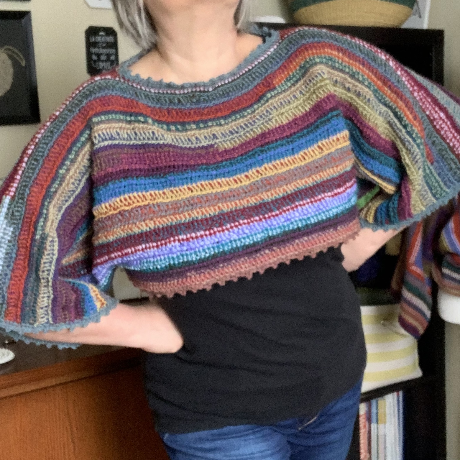 Vous ai-je dit que j'adorais les projets faits des restants de laine ? Les accros à la laine comme moi accumulent toutes sortes de laines que nous ne voulons pas jeter. J'ai confectionné des couvertures, des châles, des tops, et maintenant une liseuse, vous savez, un de ces boléros avec manches qui sont si tendances ?